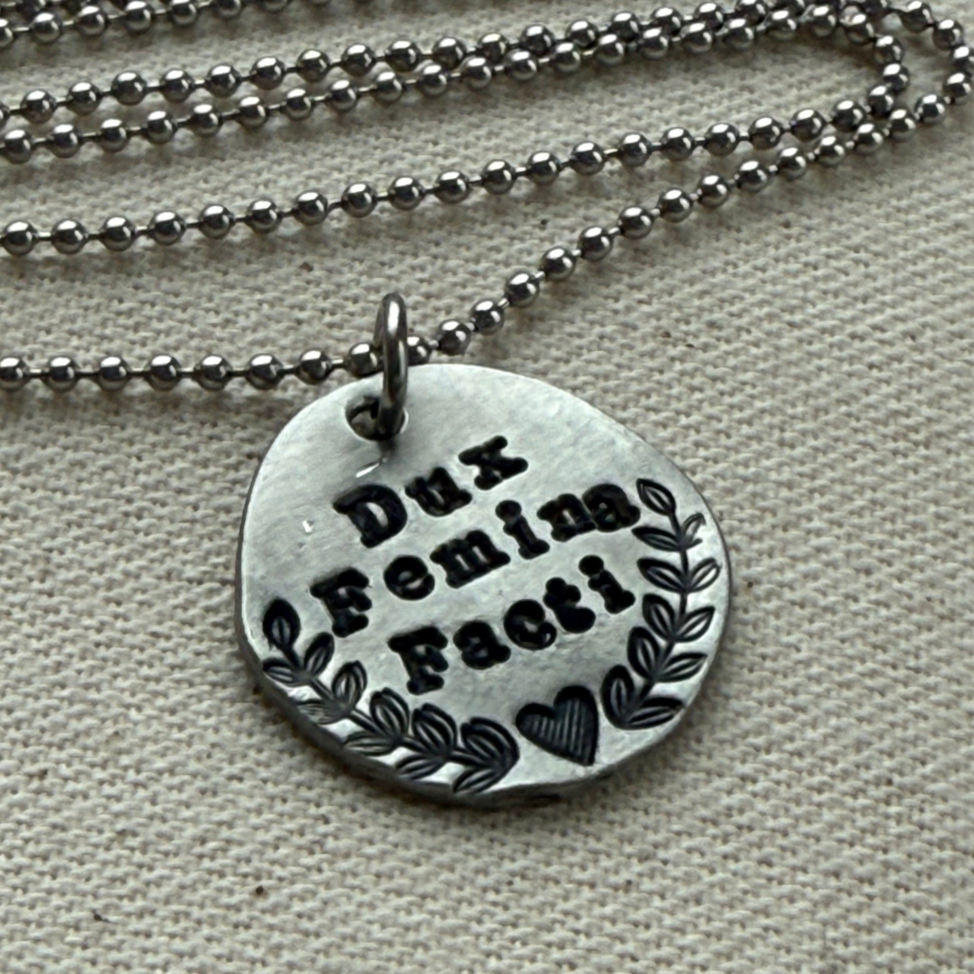 Latin Phrase DUX FEMINA FACTI is hand stamped on a pewter organic disc with leaf border. Pendant It is then oxidized, polished and finished with a brushed finish. The phrase (which appeared in the Roman epic The Aeneid referring to Dido's founding of Carthage) has now become an inspirational motto that celebrates female leadership. Pendant is approximately 3/4" diameter. Pendant is suspended on necklace as selected.
