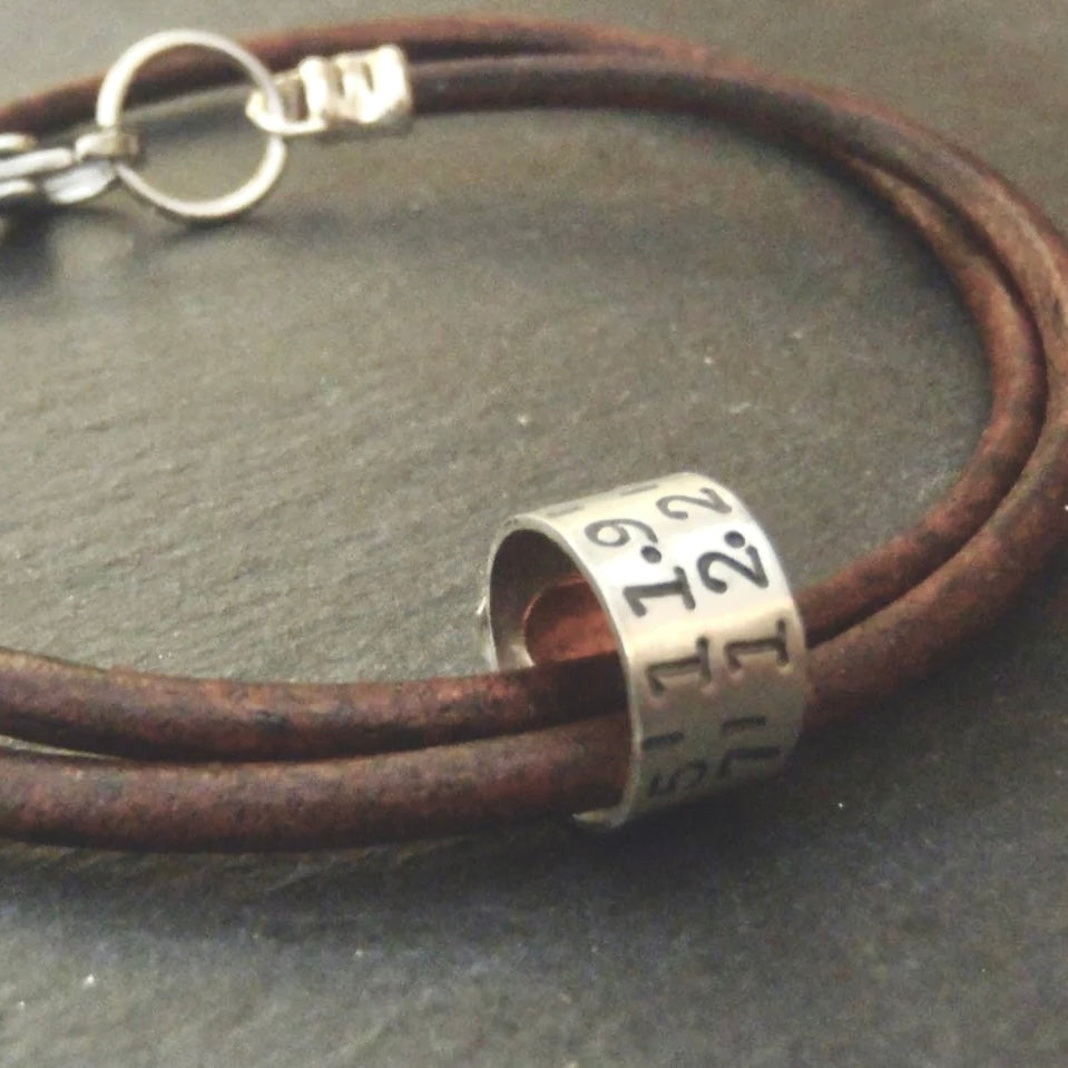 This leather bracelet is customized with coordinates charms to commemorate your special location in a keepsake for that special someone or for yourself. Bracelet is made with 3 mm smooth leather, silver plated brass endcaps, and stainless steel end rings and clasp. Personalized charm is completely hand crafted 1/4" wide solid sterling silver with a copper rivet.