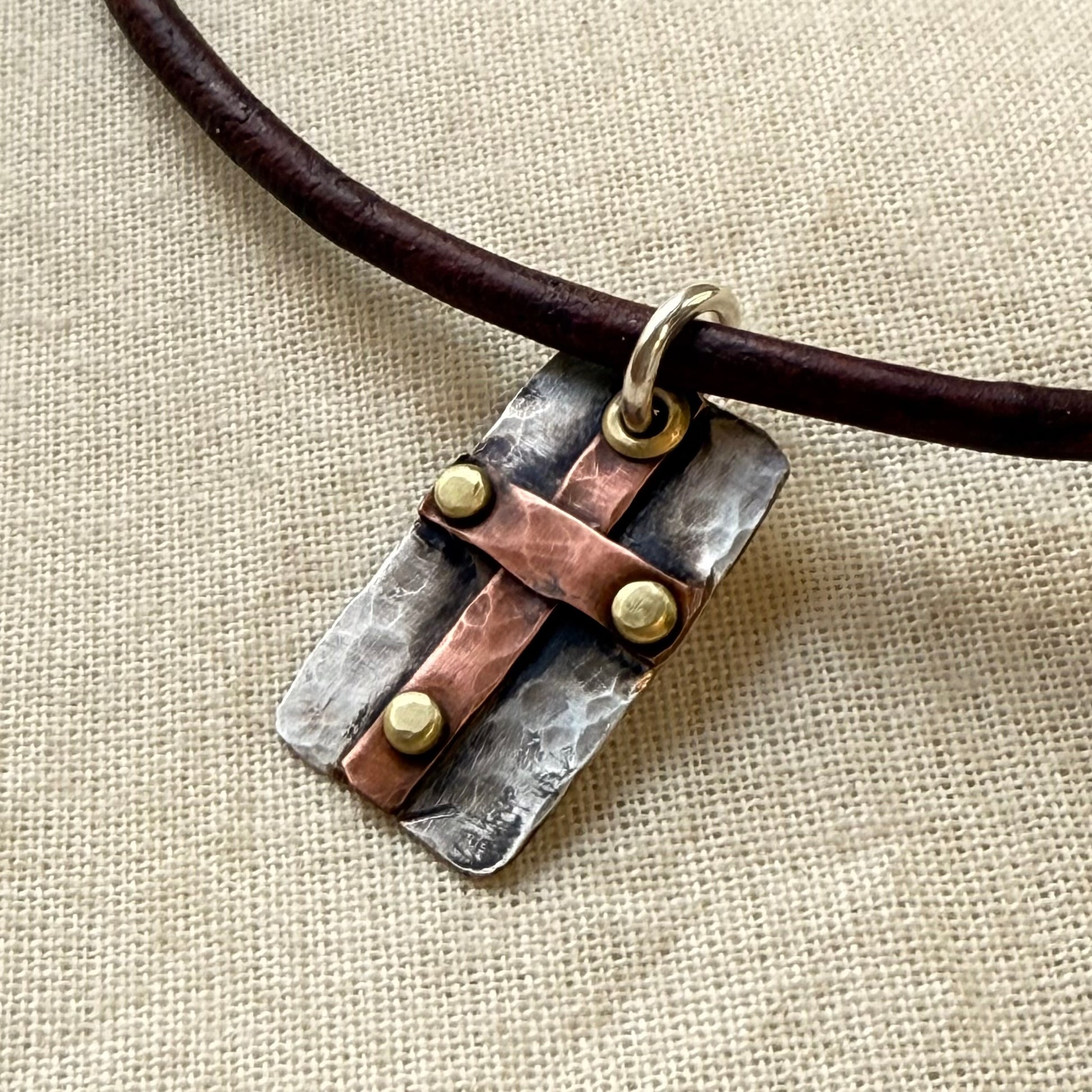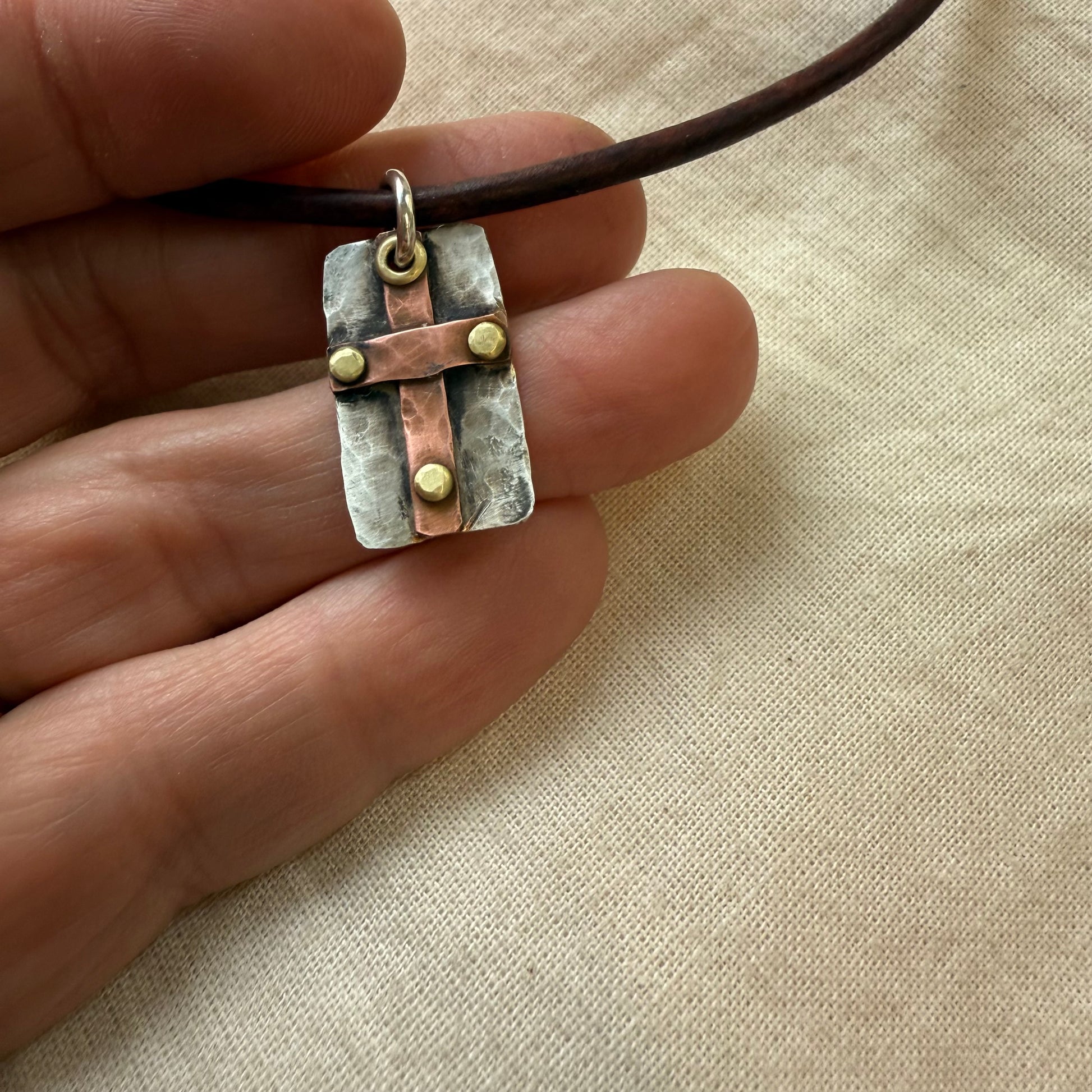 Rustic sterling silver and copper cross pendant is hand crafted from solid recycled sterling and copper sheet is which is cut, hammered and riveted by hand. Golden rivets and eyelets add golden brass accents providing contrast. Cross is suspended on leather cord, stainless steel or sterling chain as selected. Cross pendant is approximately 7/8" tall and 1/2" wide.