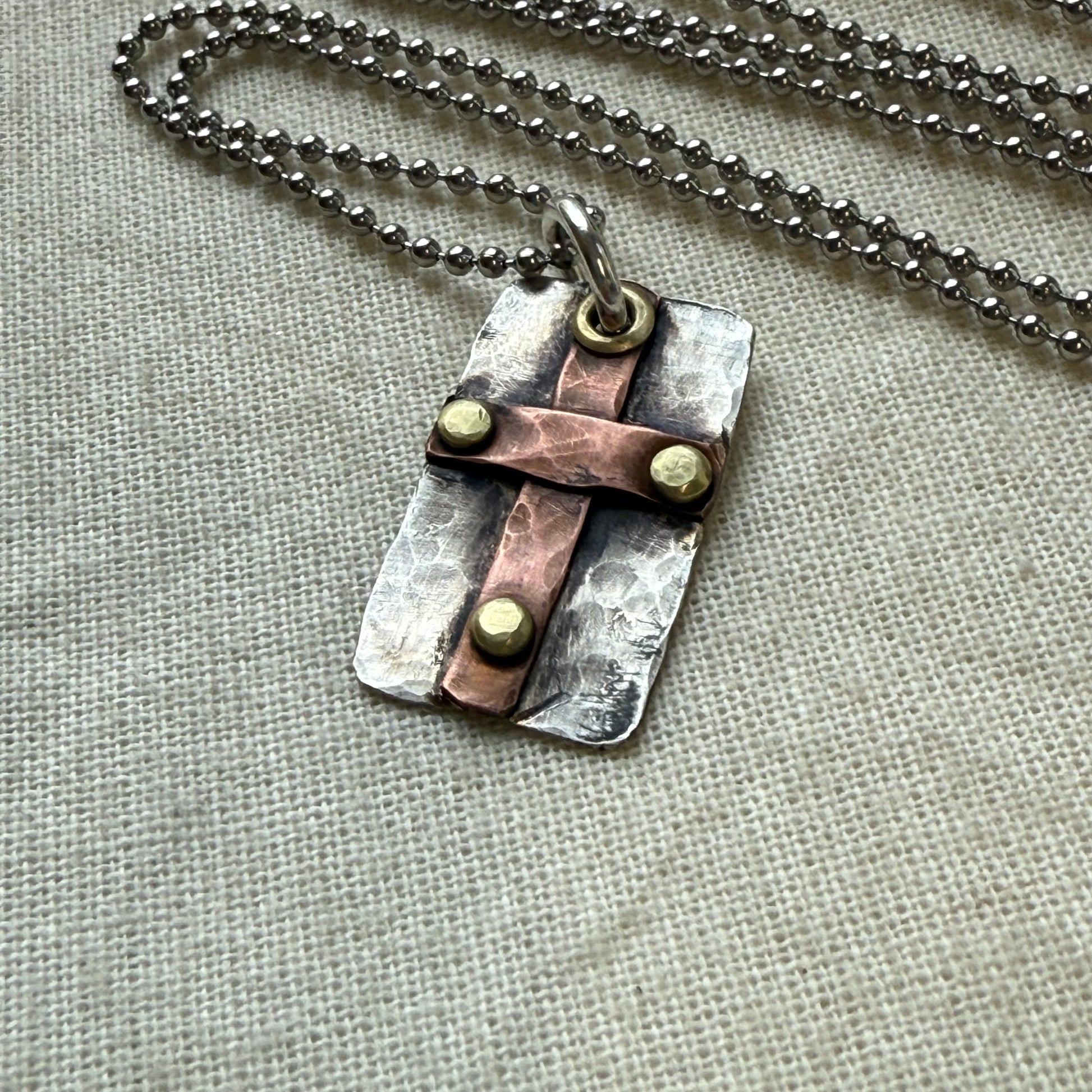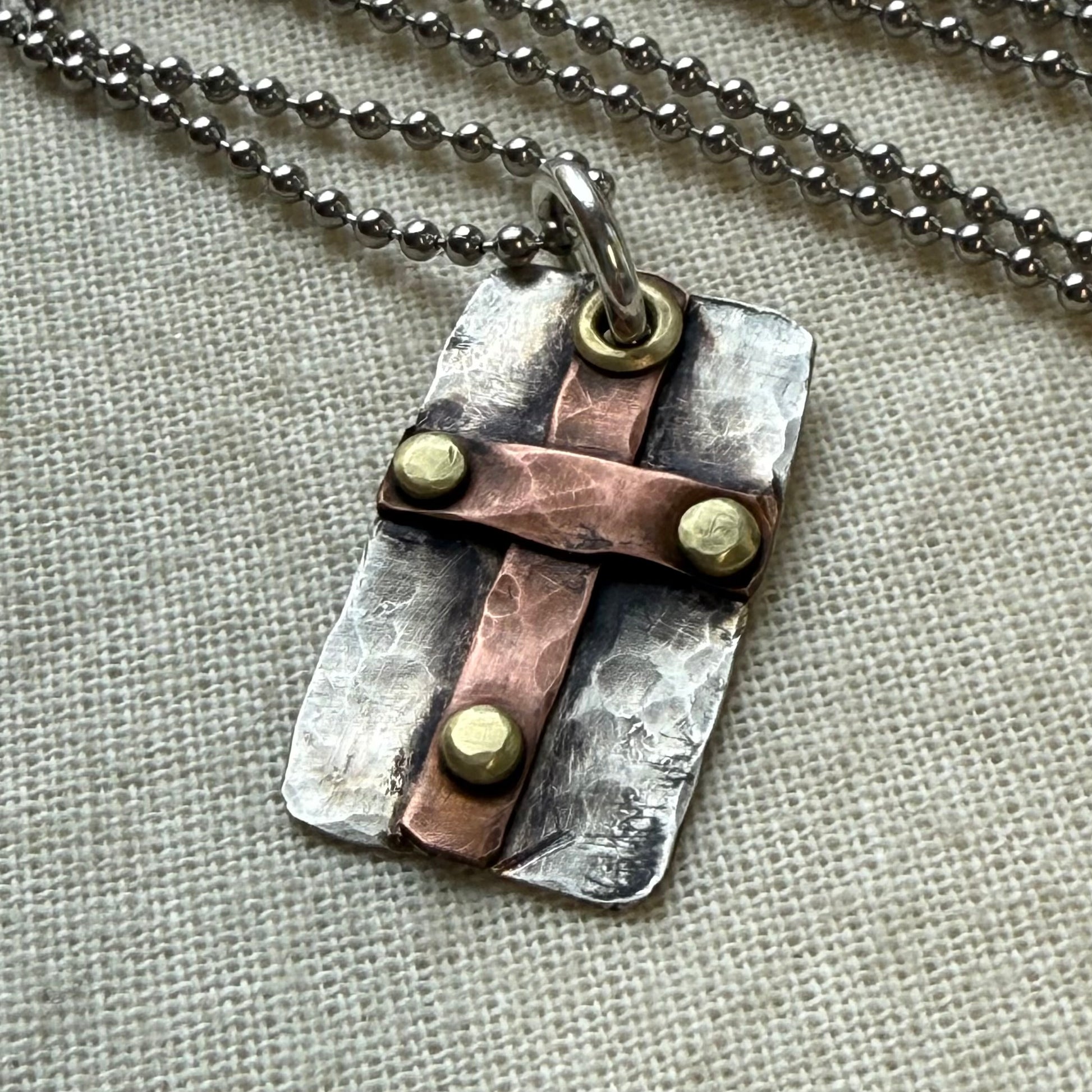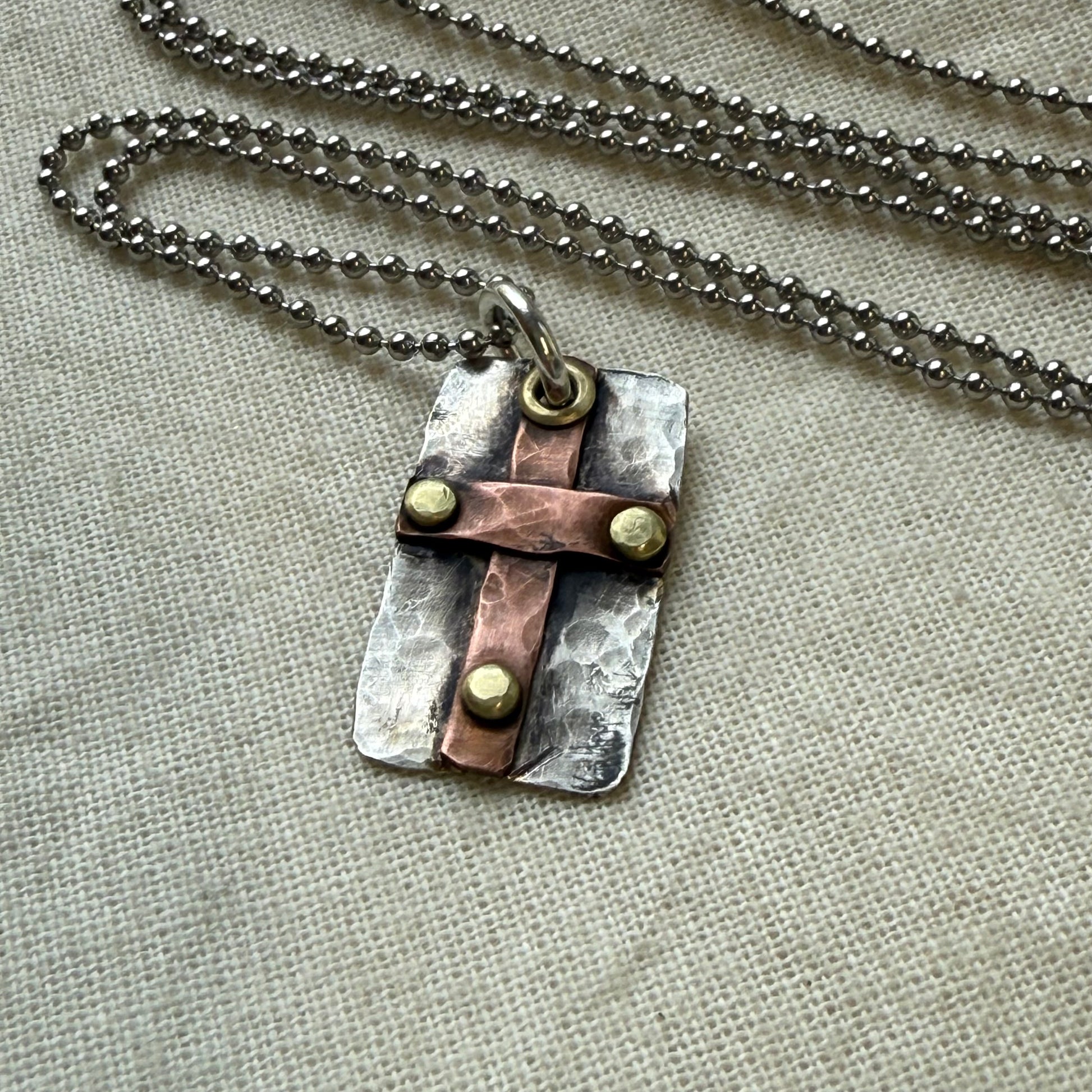 Sterling Silver and Copper Rustic Hammered Cross Necklace Hand Riveted Mixed Metal