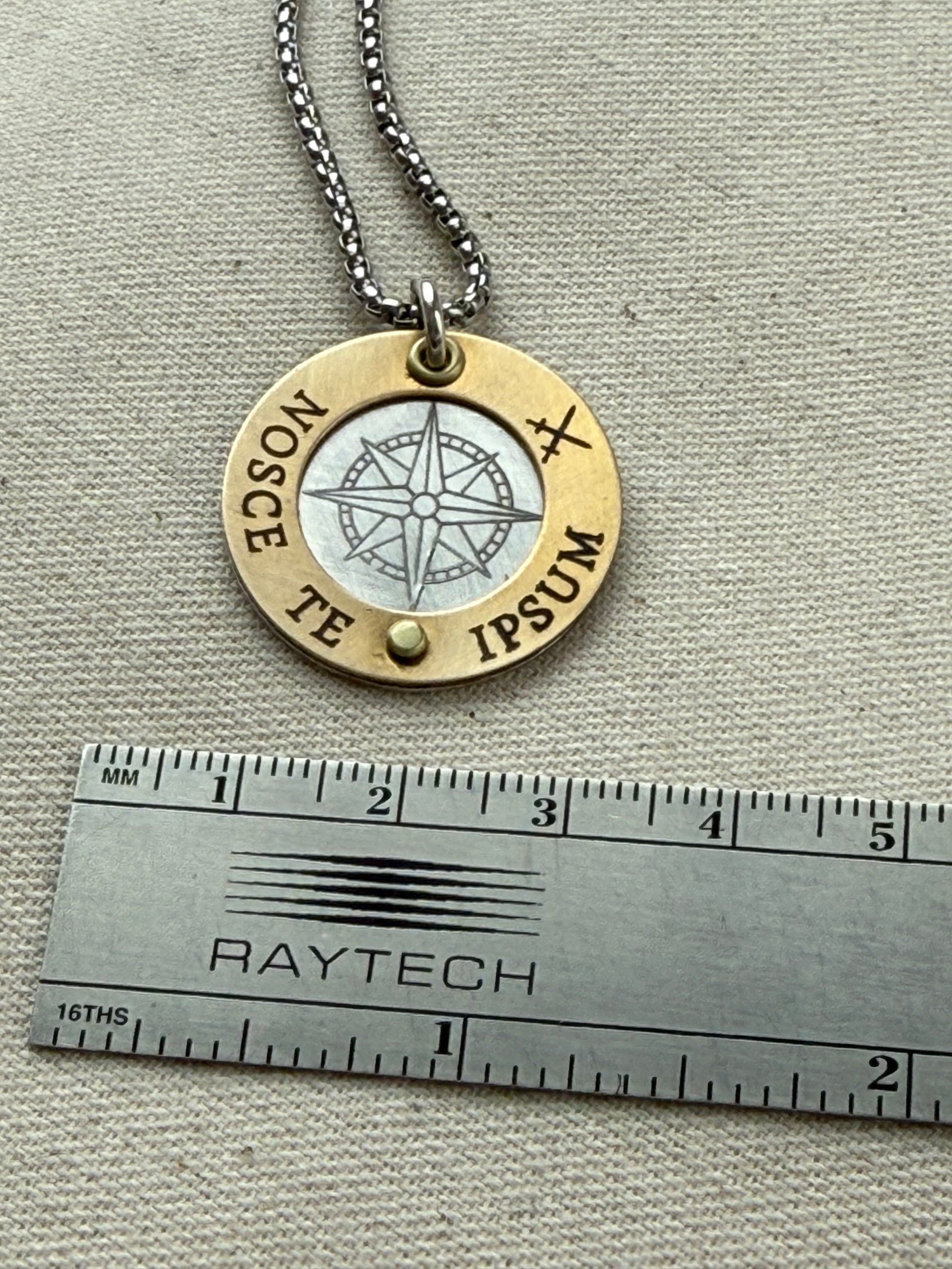 Latin Phrase "Nosce Te Ipsum" is engraved on a solid golden brass washer with a hand drawn compass rose engraved at the center with golden brass rivet and eyelets. Pendant It is then oxidized, polished and finished with a brushed finish. The phrase (which originated from Ancient Greece inscribed at the Temple of Apollo at Delphi) to encourage introspection for the discovery of one’s own true strengths and purpose. Pendant is approximately 1” diameter. Pendant is suspended on necklace as selected.